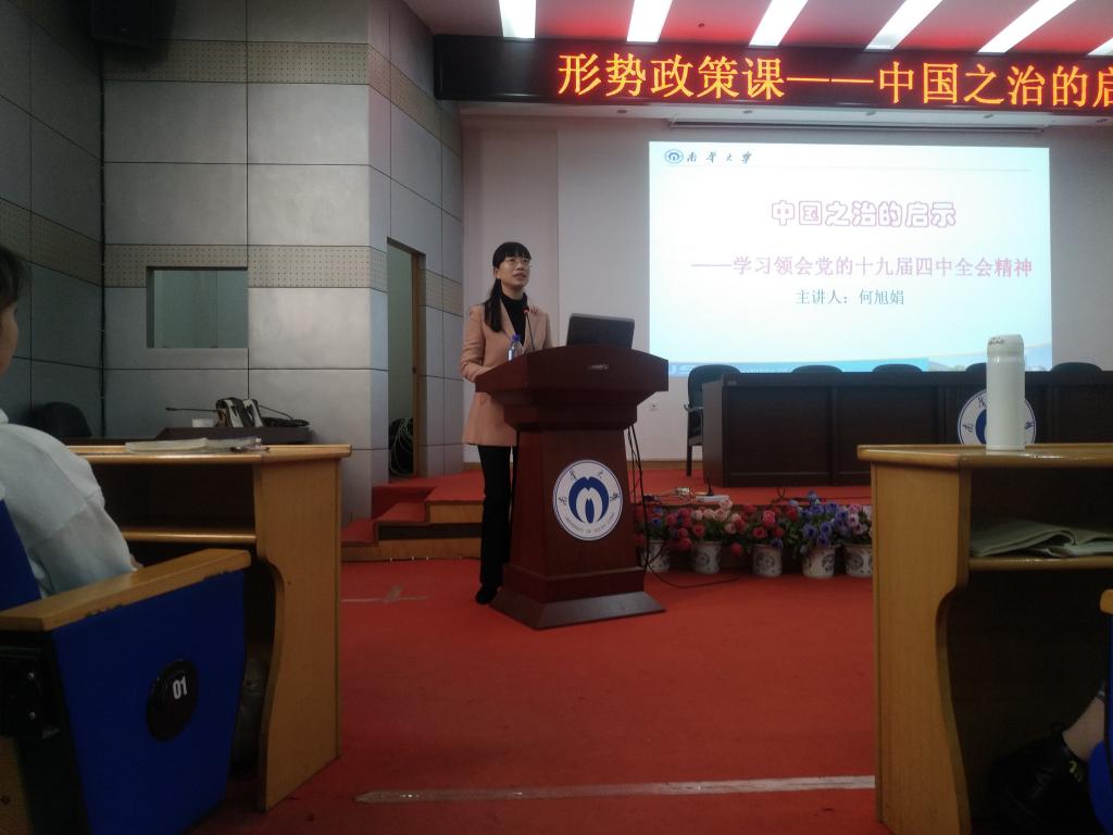12月13日下午,校党委委员、副校长何旭娟老师以《“中国之治”的启示—学习领会十九届四中全会精神》为题,在红湘校区图书馆学术报告厅为伟德国际19462017级学生上了一堂精彩的《形势与政策》课。