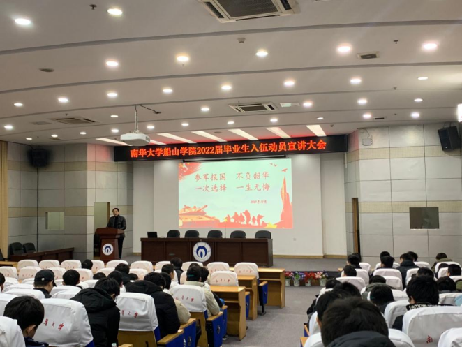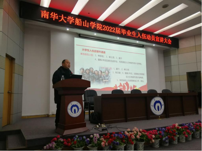 为深入贯彻习近平总书记有关做好高校毕业生就业工作重要指示精神,推动我院毕业生顺利毕业并高质量就业。2021年12月27日晚上七点半,我院2022届毕业生入伍动员宣讲大会在图书馆学术报告厅召开。伟德国际1946招生就业办主任何鹏老师、校武装部汪先利老师、伟德国际1946征兵专干何霖老师、毕业年级辅导员范婷老师以及毕业年级全体男生出席此次大会。本次会议由何鹏主持。