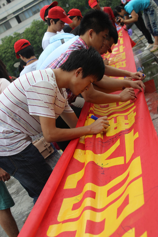 广大学子踊跃在横幅上签下自己的名字