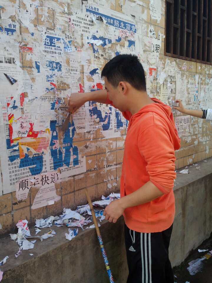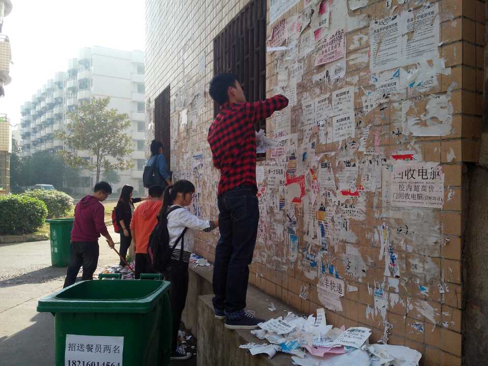 为美化校园环境,提高学生保护环境的意识。11月9日,南华伟德国际19462012级全体学生干部开展了义务清除学校“牛皮癣“的活动。 2012级学生干部分为五个小组,每个小组成员拿着小铁铲、扫帚、清洁球、水桶等工具,清除学校宿舍、街道的“各种牛皮癣”小广告。 经过几个小时的努力,墙面、电杆上恢复了干净的面容,2012级学生干部的辛勤劳动换来学校的清洁,也体现了船山学子积极向上的精神面貌!