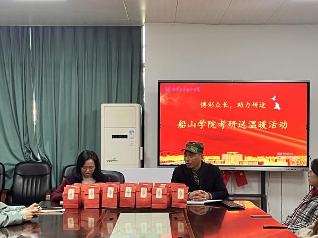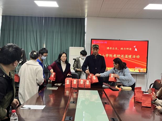 活动前期,学工室主任周英、2020级年级主任褚书来以及其他辅导员组织了一场研考座谈会,与考研学子面对面交流,关心同学们的备考情况和心理状况。周主任对备考期间的船山学子的辛勤付出表示肯定和高度赞赏,并结合自己的考研经历,传授了调整心态的方法,鼓励大家坚持到最后,创造美好未来。褚主任向大家表示关心慰问,强调查漏补缺的重要性,叮嘱同学们劳逸结合,以坚定的信心和饱满的热情迎接挑战!学院老师们一同为考研学生代表发放了“金榜题名礼包”,礼包为定制牛皮纸袋、巧克力、香橙以及学弟学妹们亲手写的贺卡,希望考研学子能够“巧克”难题,一战“橙”硕,金榜题名!