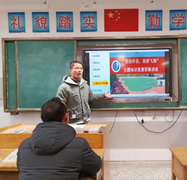 本次活动共计70人报名,组建队伍7支,于2024年1月5日至1月30日期间,分别返回母校开展资助宣讲活动。作为学院资助大使,熊旭辉及肖湘麟同学取得了不错的效果。其中,熊旭辉同学利用主题班会,向母校的学弟学妹们详细解读学生资助政策,帮助其充分了解各项资助政策的申请流程,并通过资助知识竞答的形式帮助大家深入了解政策,解答同学们的疑问;肖湘麟同学在普及政策的同时,讲述了自己的受助经历,并积极引导有受助经历的同学讲述自己的故事,对学生们进行资助感恩教育,鼓励大家受助后回报祖国,感恩守信,以德树人。