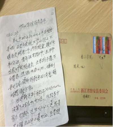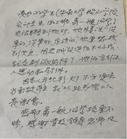 令葛一航感到意外的是,自己小小的举动,却让素未谋面的老人亲自向学校写了一封感谢信,对葛一航同学拾金不昧的行为高度赞扬。老人的字迹不是很清晰,但却写了满满两大版,字里行间都透露着她最真挚的感谢。这不仅是对葛一航找回自己失物的感谢,更是对学校能培养出这种优秀品格的学生表示由衷的认可。