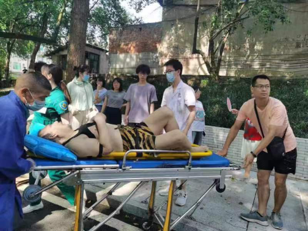 他们先把老人放平,然后用附件的纸盒将老人头部支撑起来为老人遮阴扇风去暑,附近的一位阿姨带来了两杯水。此时胡㻰璇正在咨询老人一些问题,这个时候老人已经开始翻白眼了,她便接过阿姨给的两杯水,先是将老人的上衣掀起,然后用手将第一杯水洒在老人身上。而后趁着他还有一些意识慢慢的将第二杯水喂给他喝。为了让老人清醒一些,苏琼庶等人便给老人扇风,之后还有机械学院的刘军老师也来帮助老人。直到救护车来临几人便合力将老人送上了救护车。