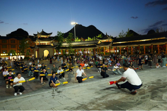 舞蹈中一共有24个动作,如“转天转地”“寻屋地”“挖屋地”“铲屋地”“平屋地”“量屋地”“砍木”“背木”“架木马”等,每一个动作,老师都教得认真,志愿者们学得仔细。当天晚上,志愿者和当地居民共同演绎长鼓舞,开展了2024年“千人长鼓舞教学”瑶文化传承活动,丰富当地精神文化生活。